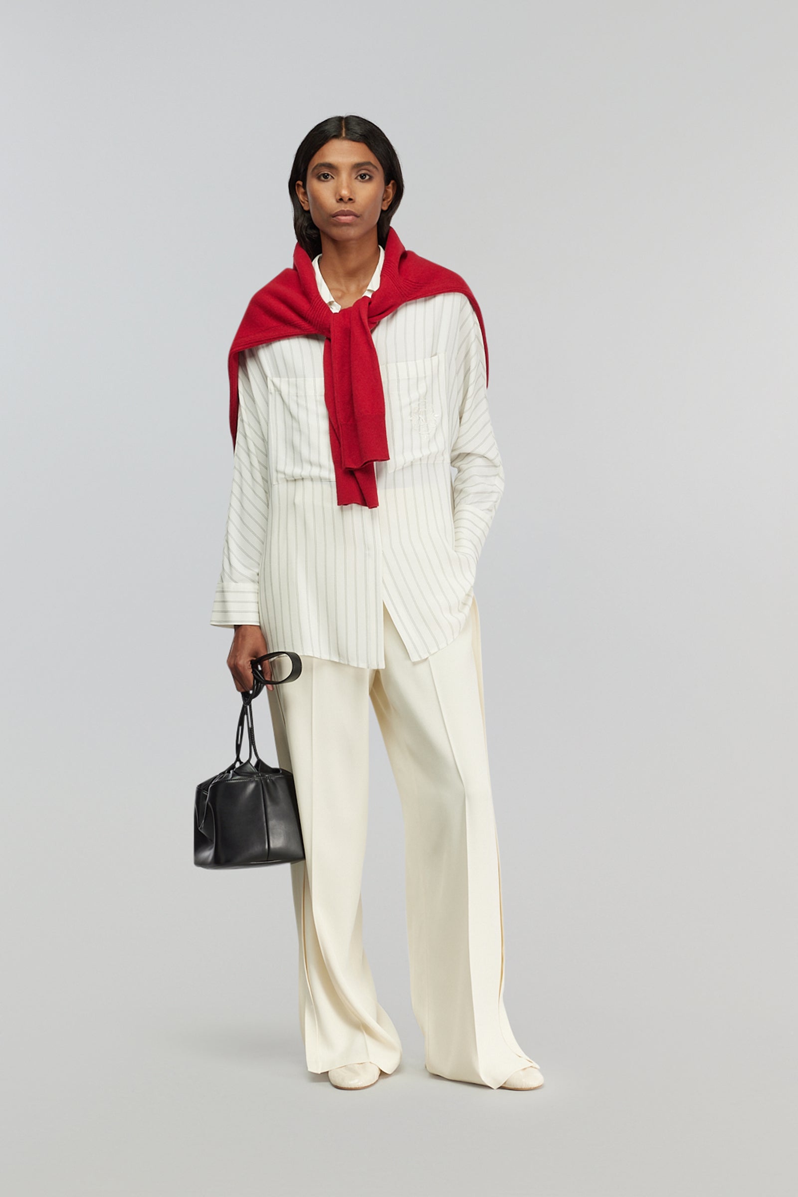 Pinstriped crepe de chine shirt. Front closure with bow. Regular fit and hip length.