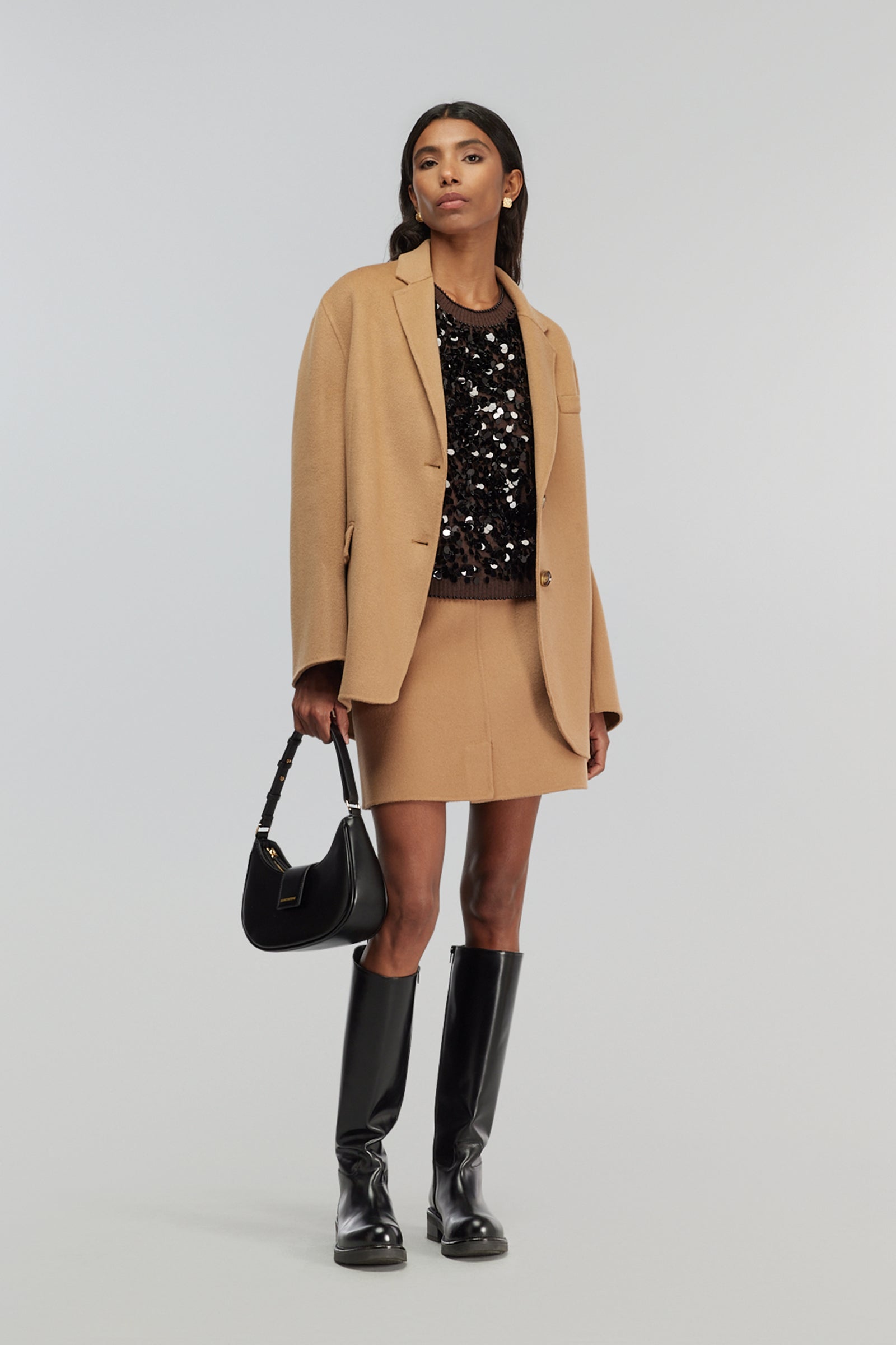Double cloth single-breasted jacket. Wide V-neck, closure with two horn buttons. Regular fit, hip length.