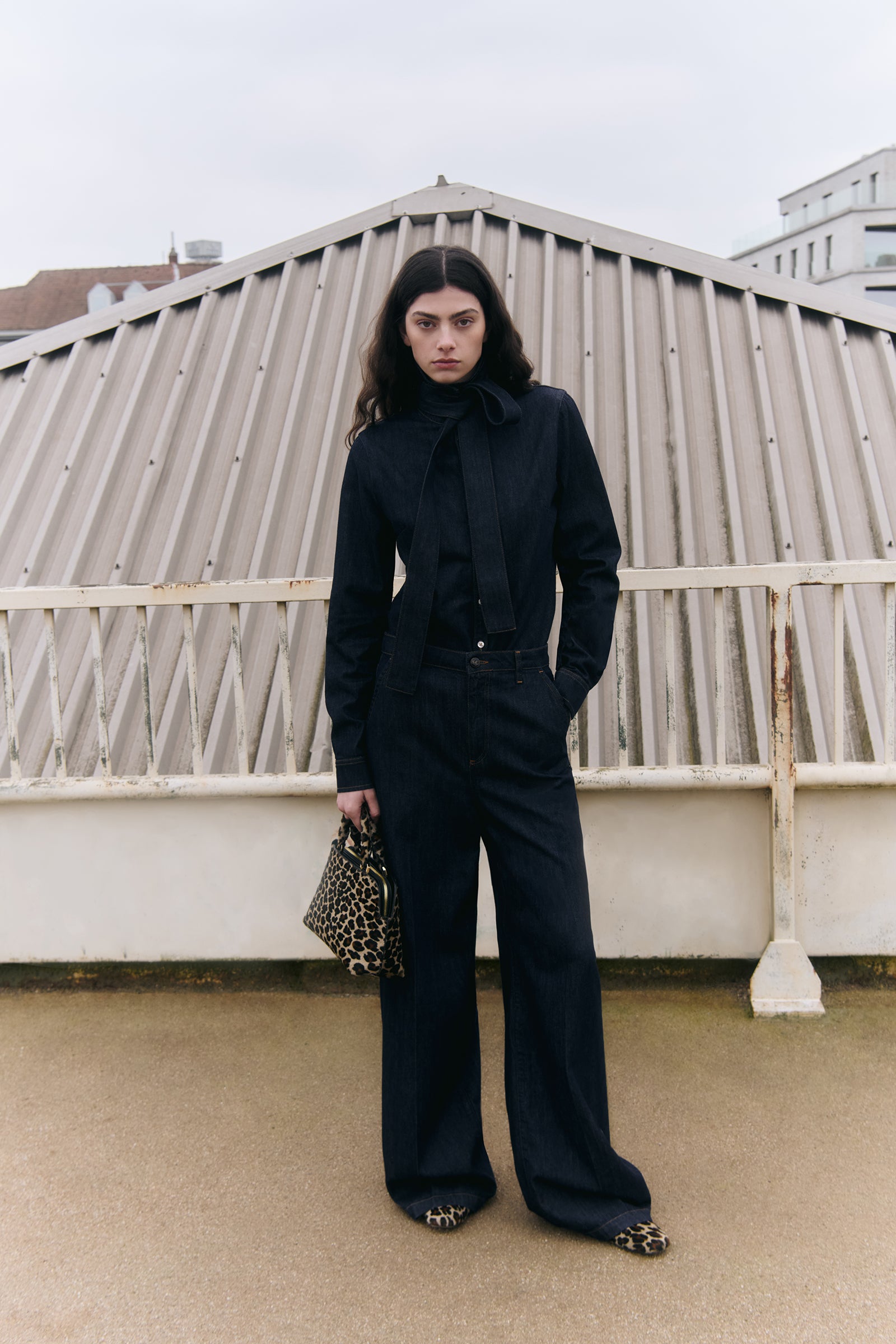 Camicia in denim di cotone. Abbottonatura frontale. Dettagli chiusura collo con fiocco. Vestibilità regular e lunghezza bacino.
