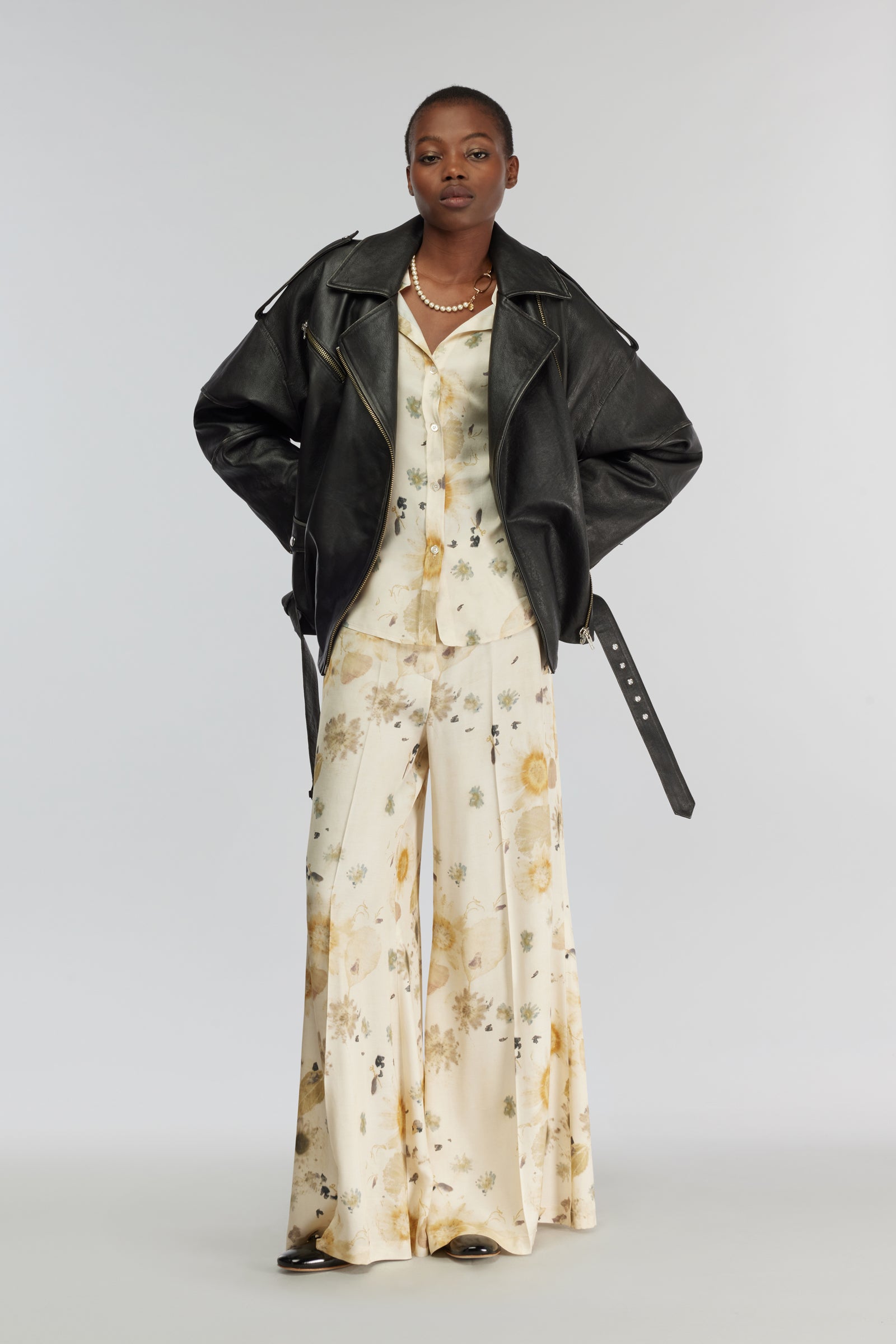 Abito stampato a fiori su twill. Dettaglio scollo a V con "sciarpa" integrale e leggermente più ampio sul fondo. Vestibilità regular.