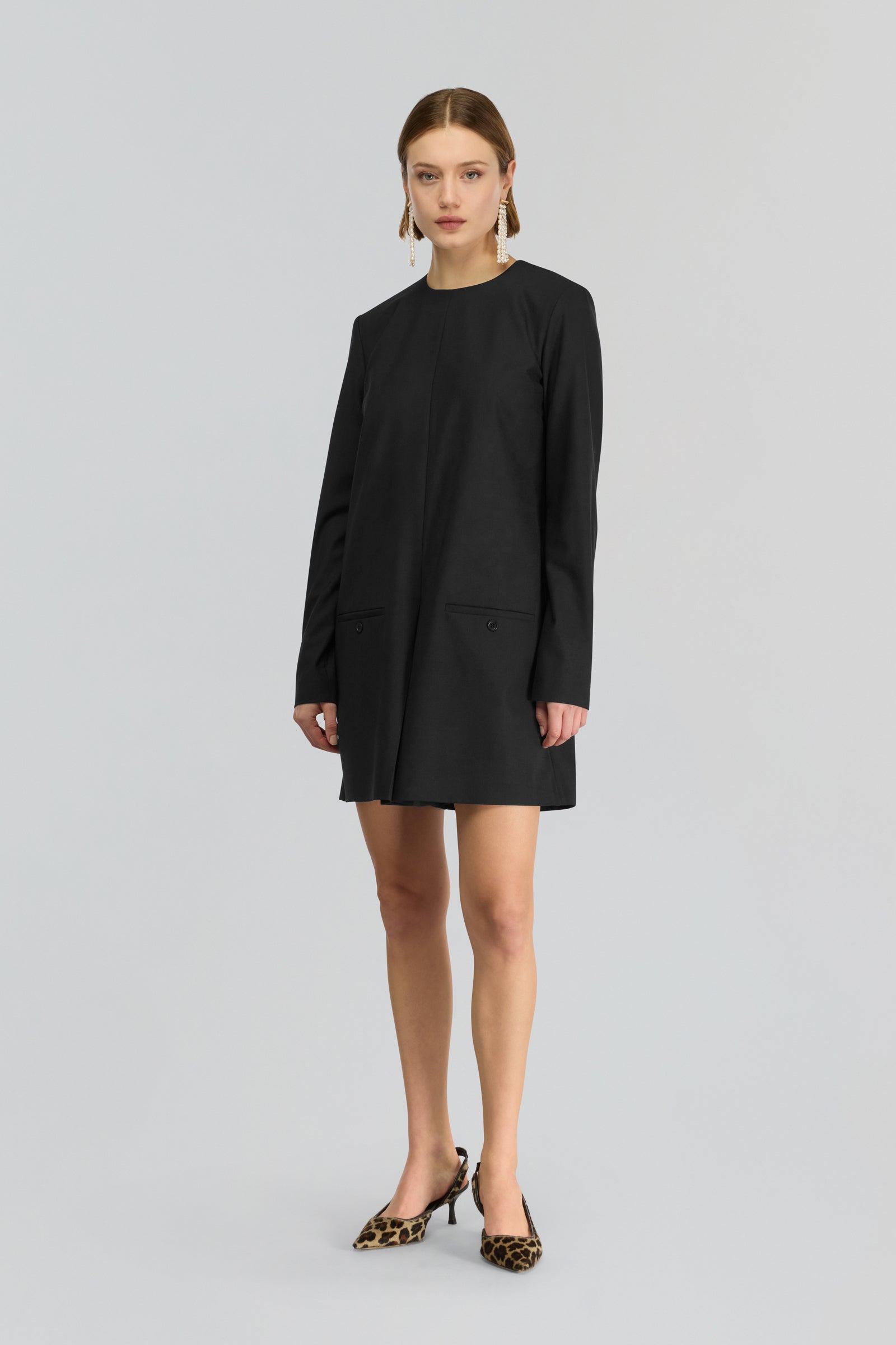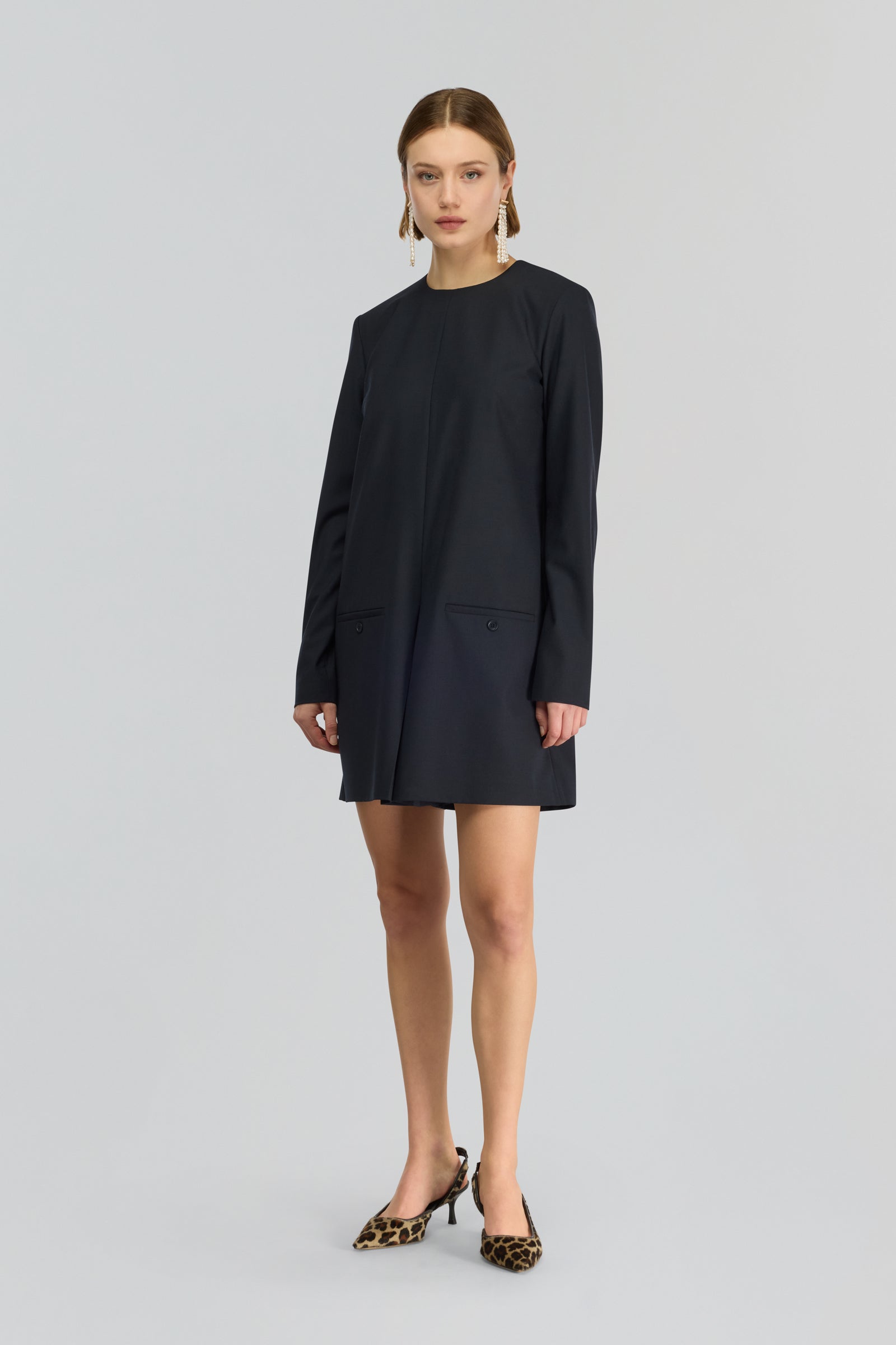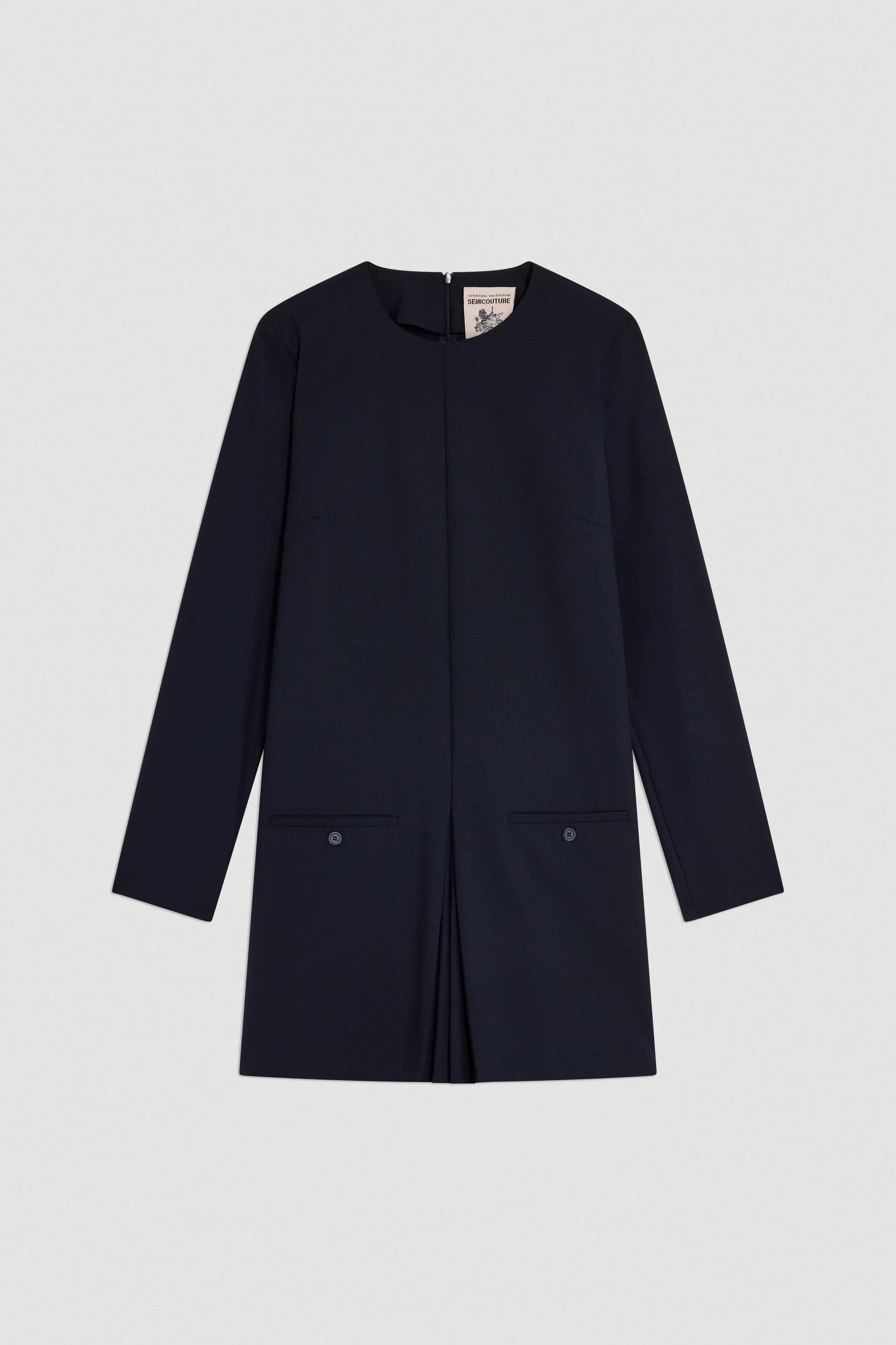 Tuta in fresco di lana. Modello girocollo, manica lunga. Due tasche a filetto. Vestibilità regular.