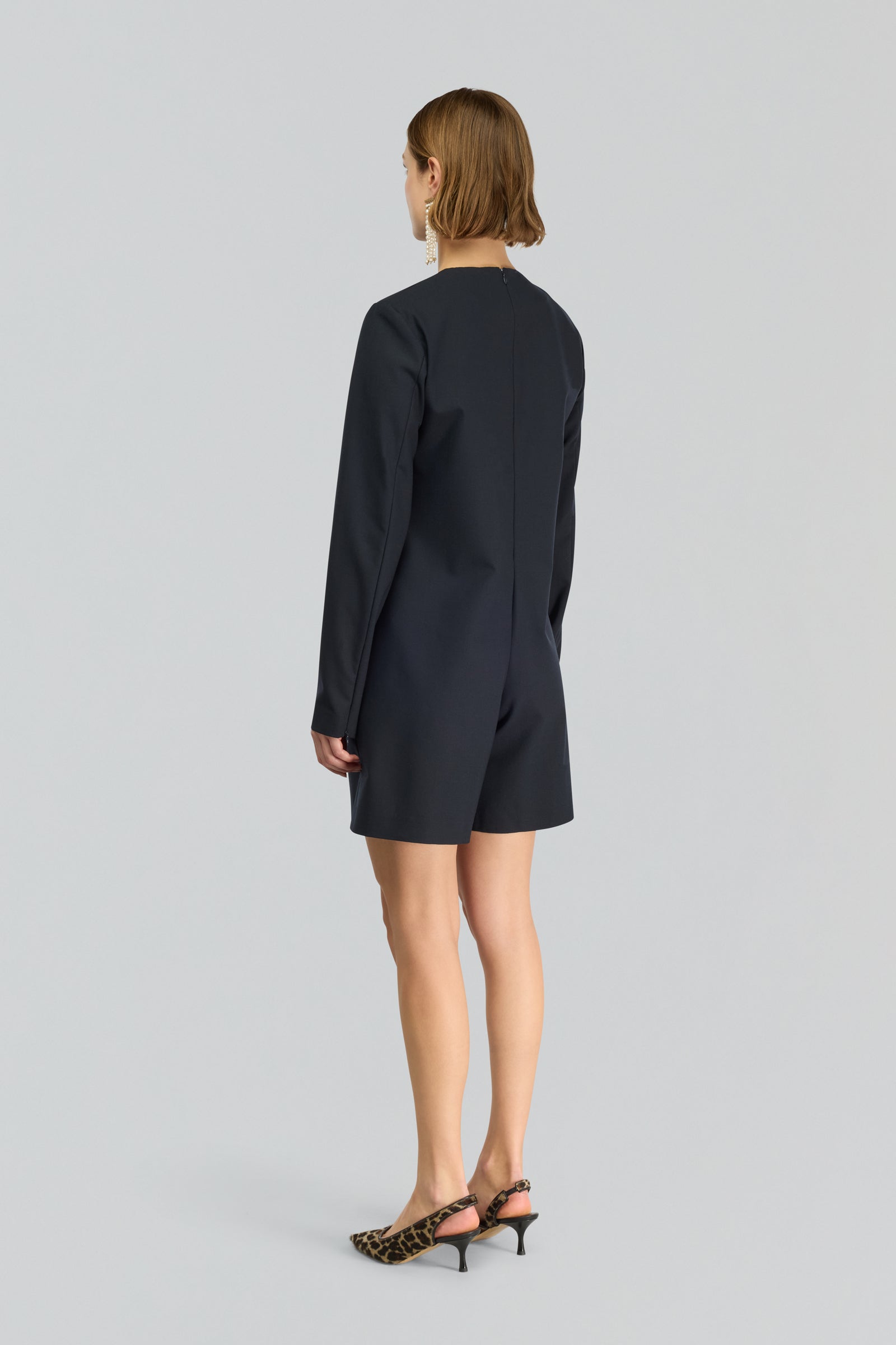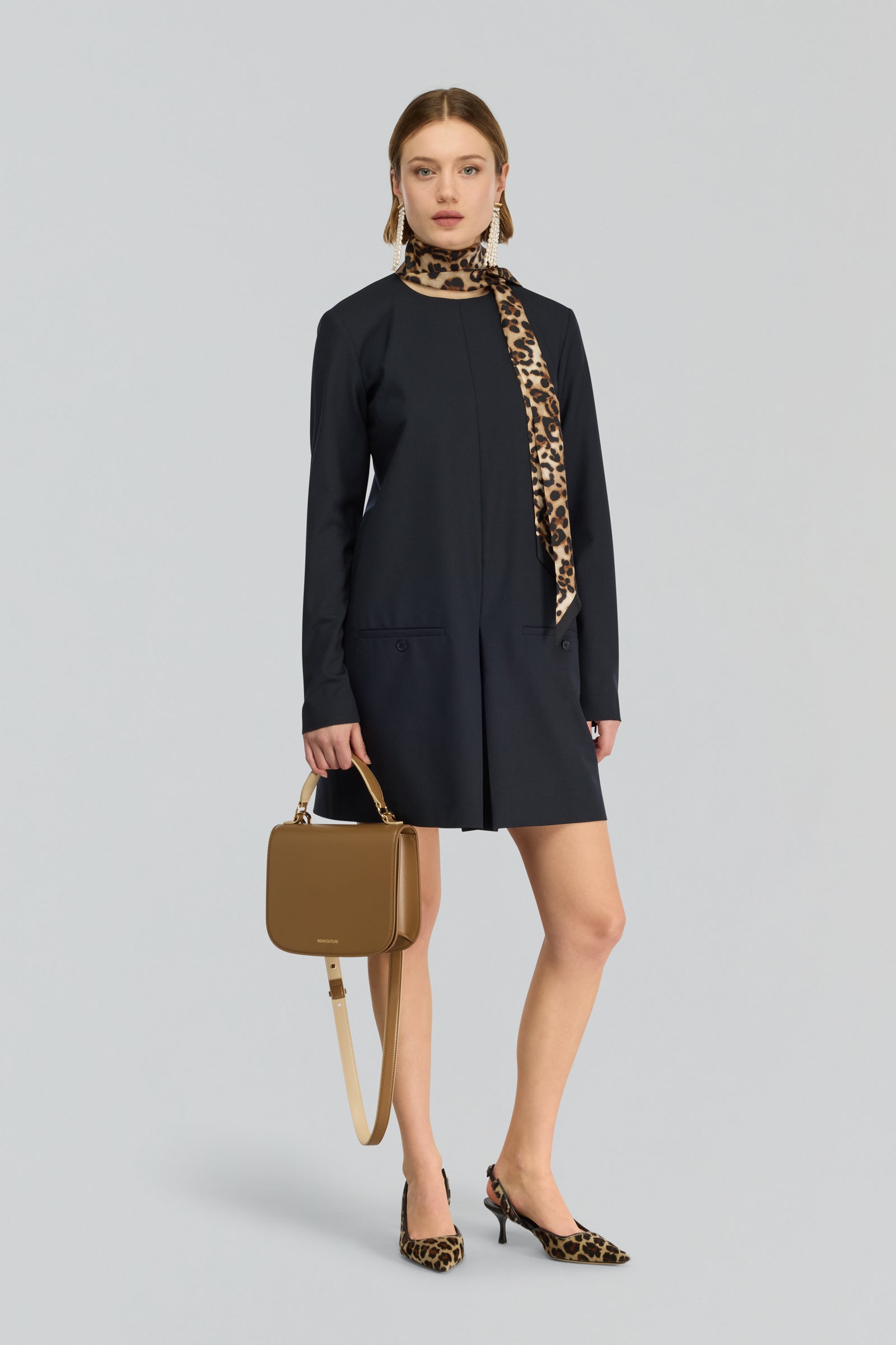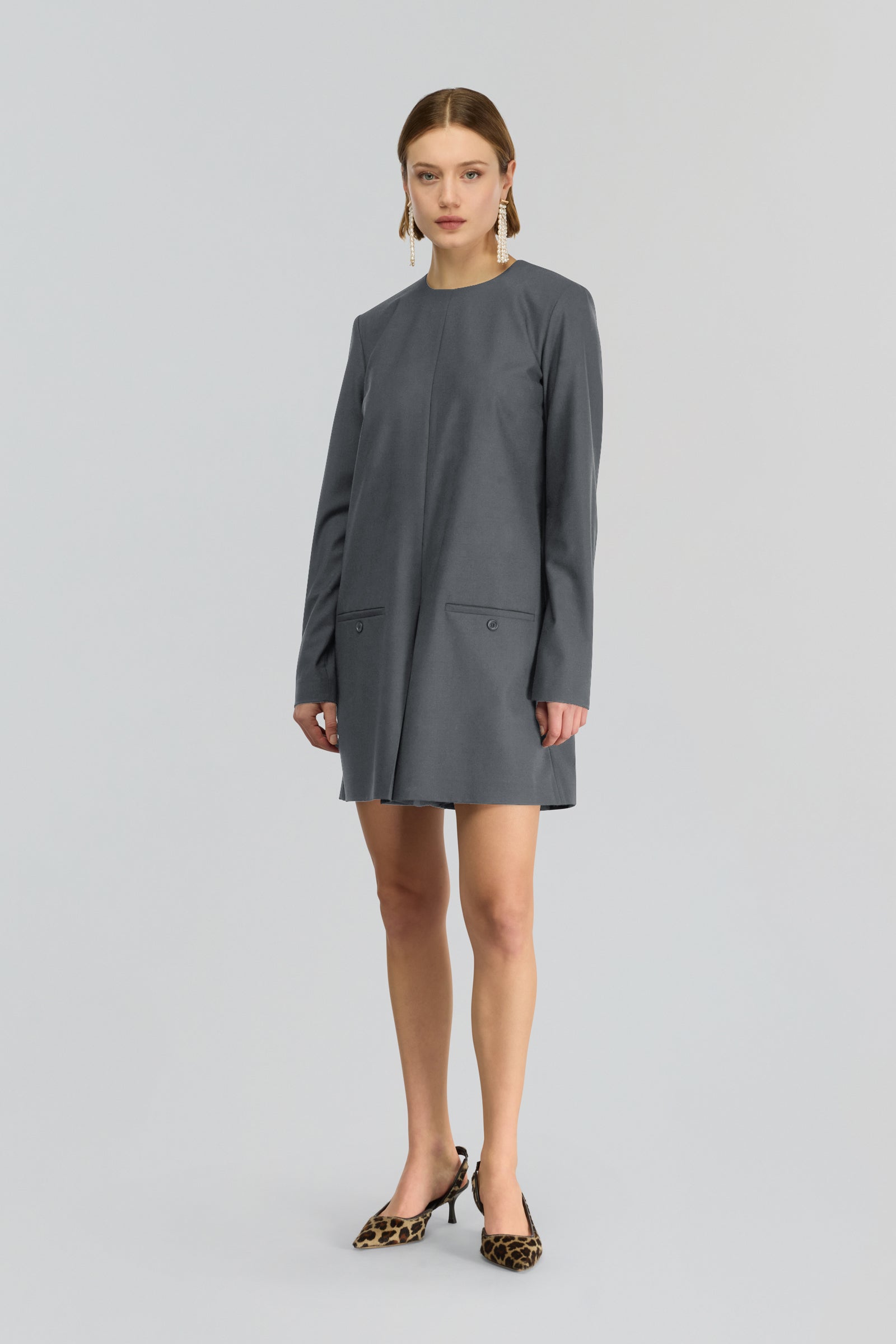 Tuta in fresco di lana. Modello girocollo, manica lunga. Due tasche a filetto. Vestibilità regular.